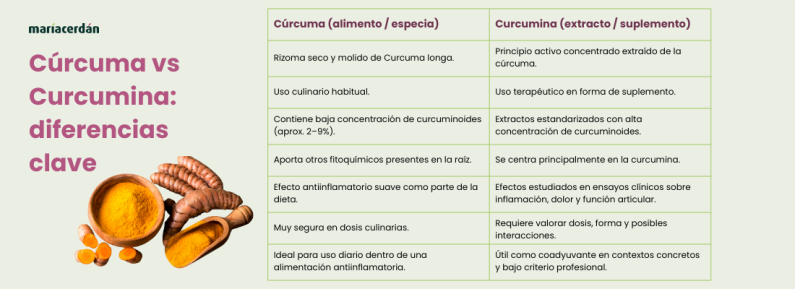 - No es lo mismo la cúrcuma, que es una especia culinaria, que la curcumina, que es el extracto concentrado de la raíz de cúrcuma.