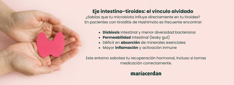 Uno de los estudios más relevantes en este campo (Knezevic et al., 2020) describe cómo los pacientes con hipotiroidismo autoinmune presentan una microbiota reducida en cepas beneficiosas como Lactobacillus y Bifidobacterium, y una expansión de cepas proinflamatorias. Además, se ha observado una disminución de bacterias productoras de butirato, un ácido graso esencial para la integridad intestinal y la regulación inmunitaria. Esto podría justificar que las pacientes con Hashimoto no terminen nunca de encontrarse bien y de resolver los síntomas asociados a la enfermedad.